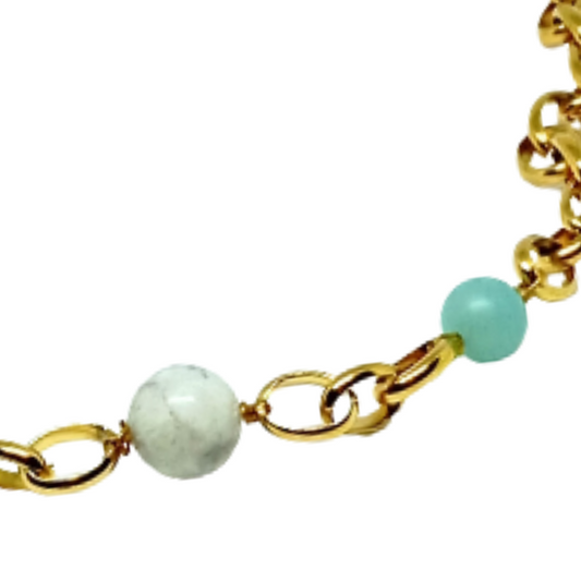 HALSKÆDE AMAZONIT. Guld, rustfrit stål, naturlig amazonit. Kvinde. Håndlavet i Danmark