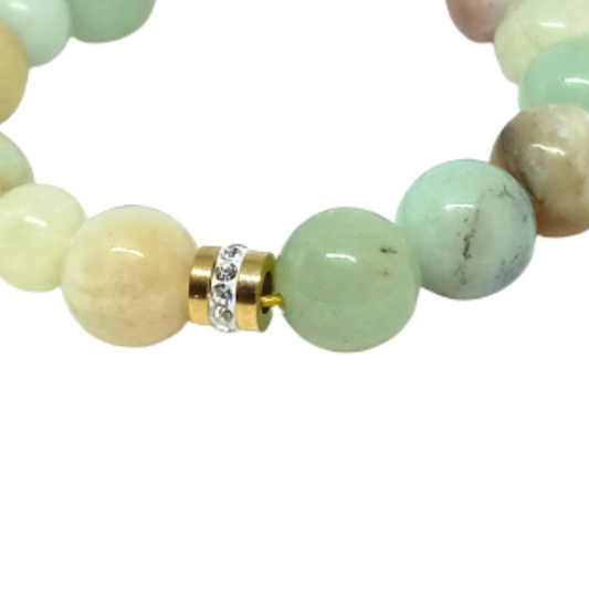 BRACELET JUNGLE. Gold, stainless steel, natural amazonite, charm, crystal. Women. Handmade in Denmark