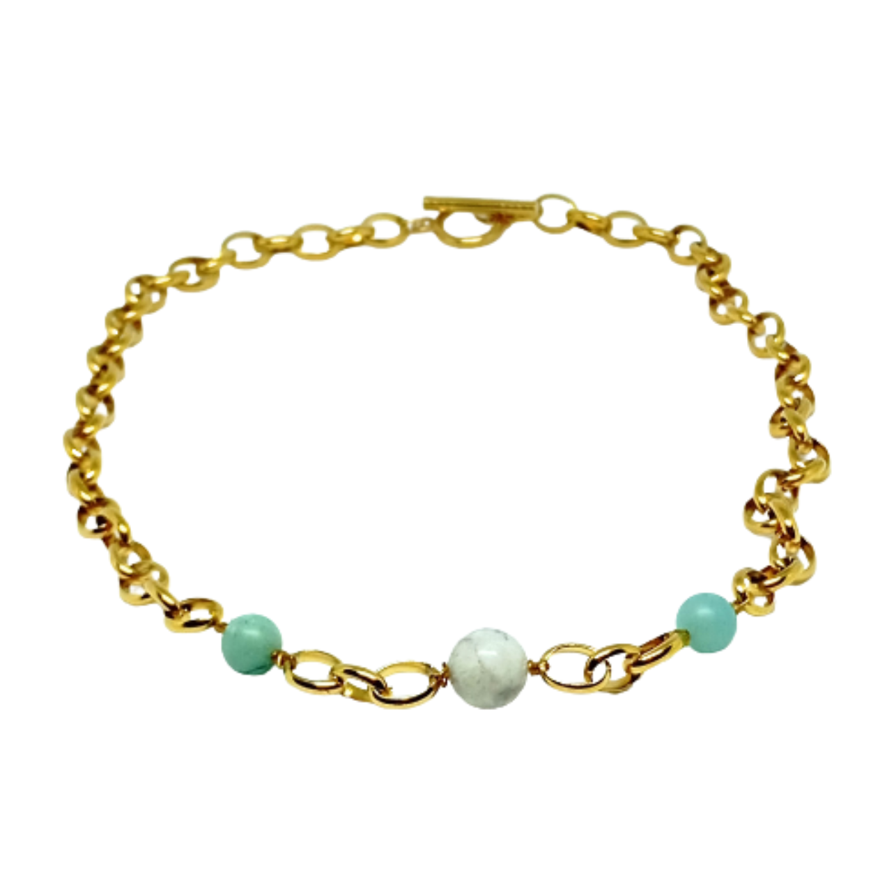 HALSKÆDE AMAZONIT. Guld, rustfrit stål, naturlig amazonit. Kvinde. Håndlavet i Danmark